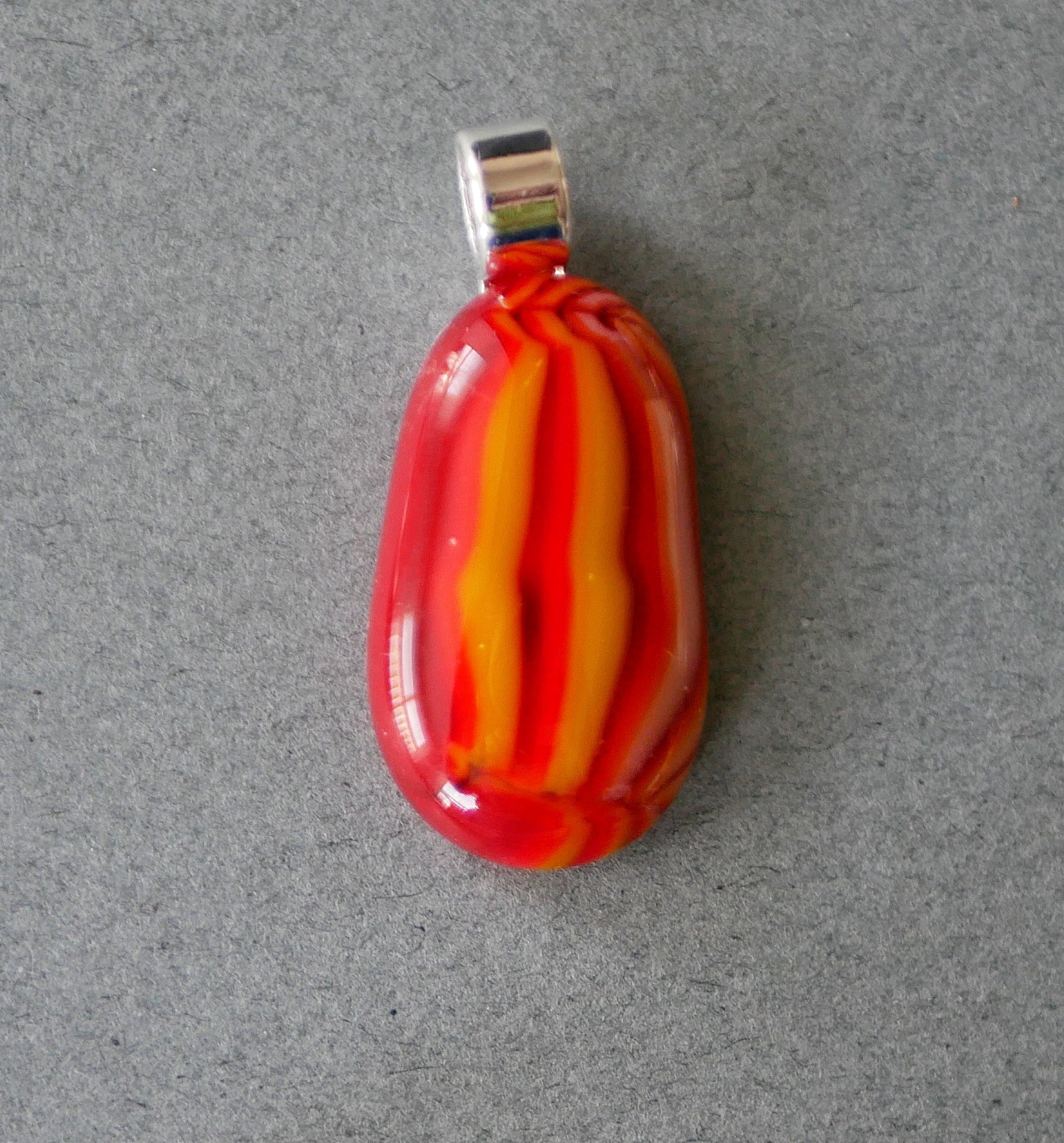 Handmade in my kiln by me! A pendant made from murrine scrap, creating a stripey pattern. These look a bit like sea cucumbers to me.