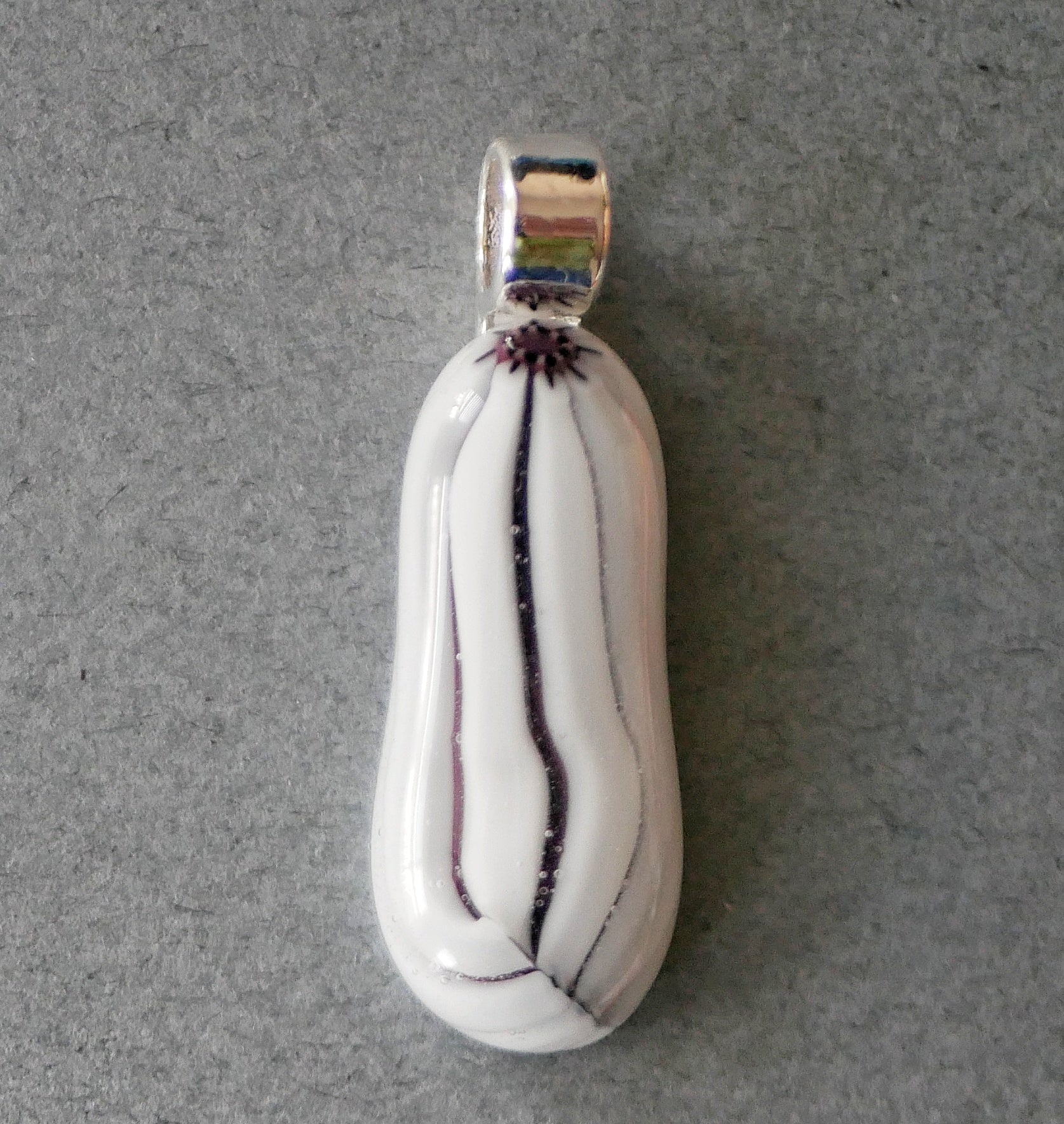Handmade in my kiln by me! A pendant made from murrine scrap, creating a stripey pattern. These look a bit like sea cucumbers to me.