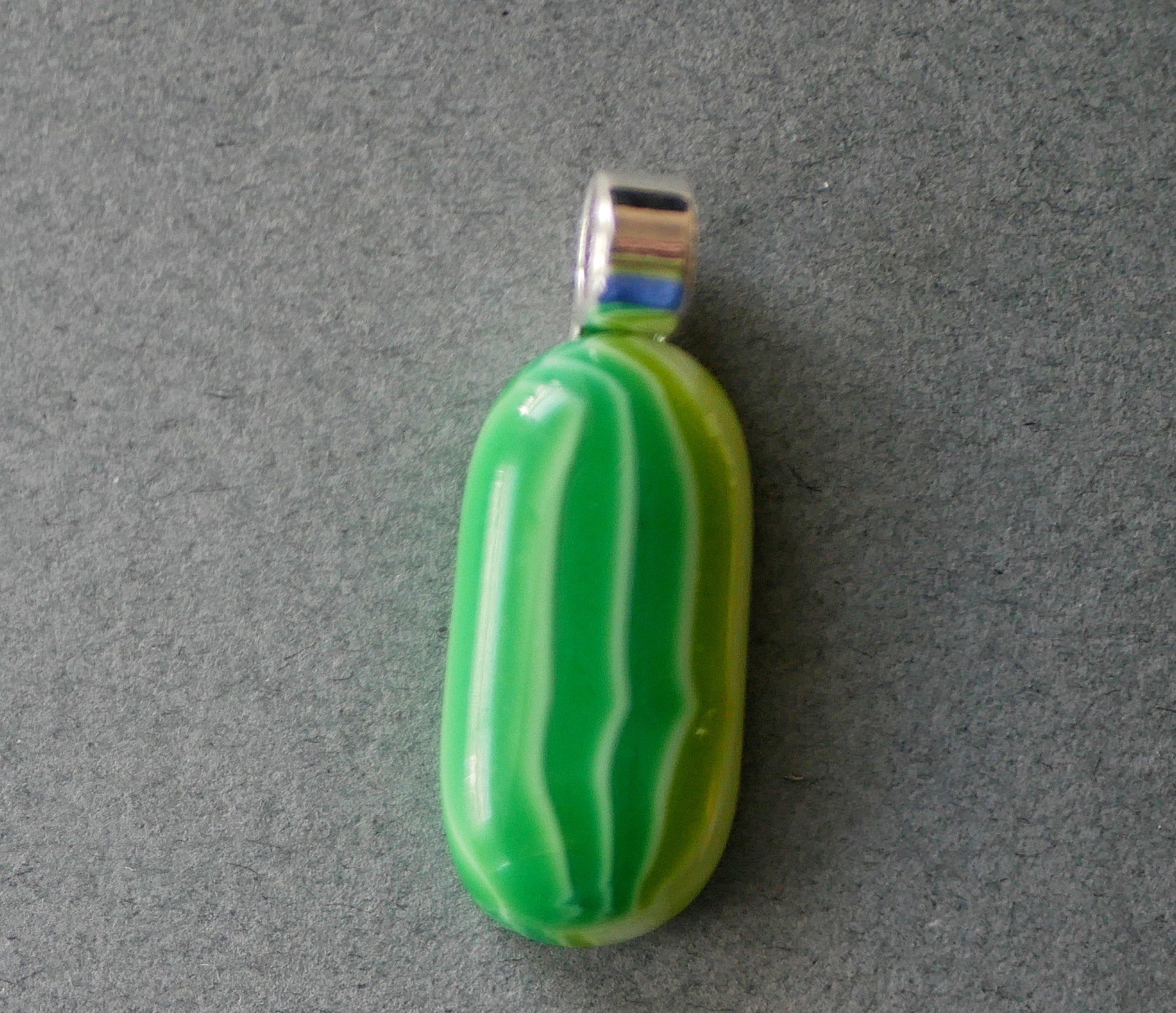 Handmade in my kiln by me! A pendant made from murrine scrap, creating a stripey pattern. These look a bit like sea cucumbers to me.