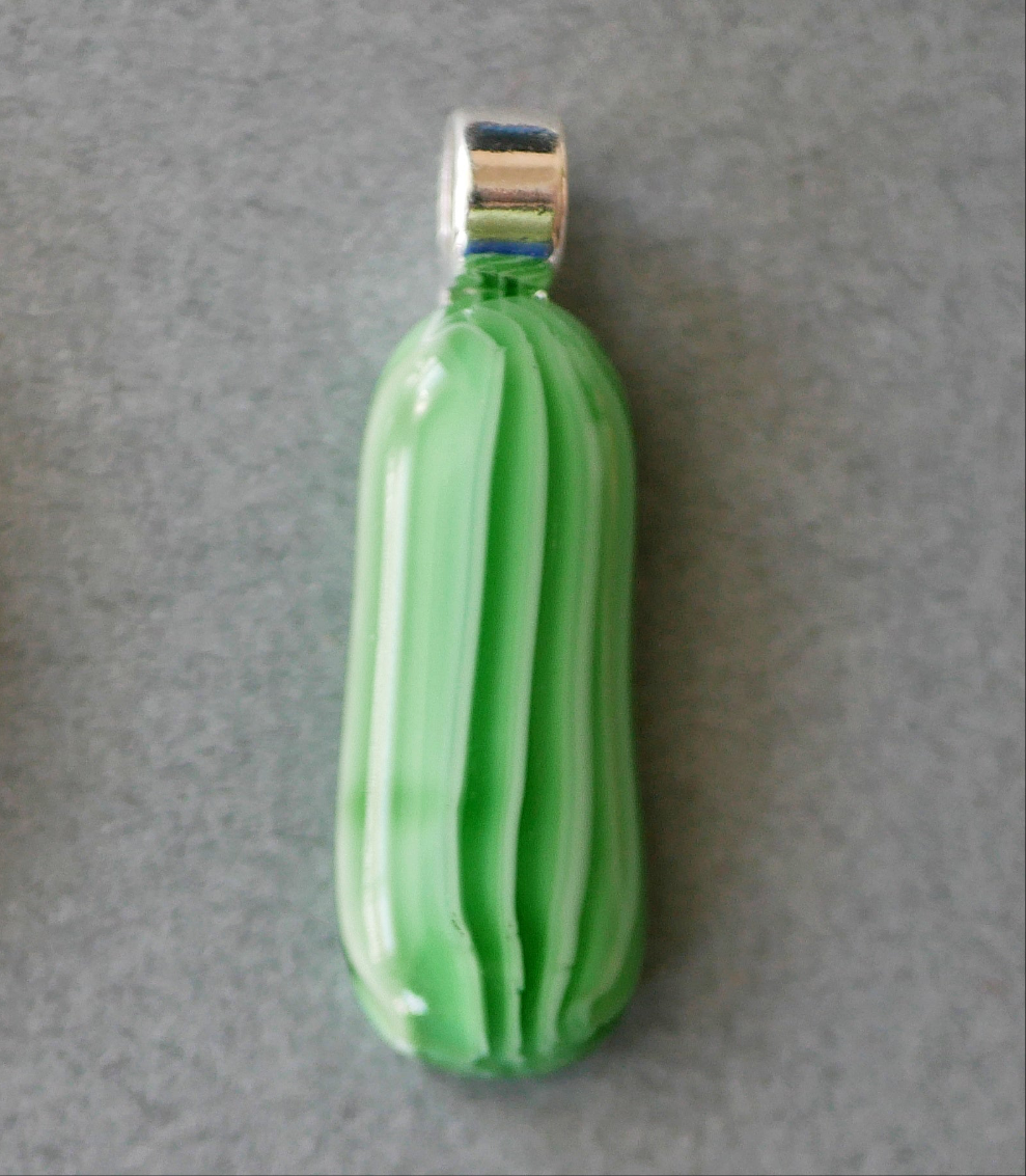 Handmade in my kiln by me! A pendant made from murrine scrap, creating a stripey pattern. These look a bit like sea cucumbers to me.