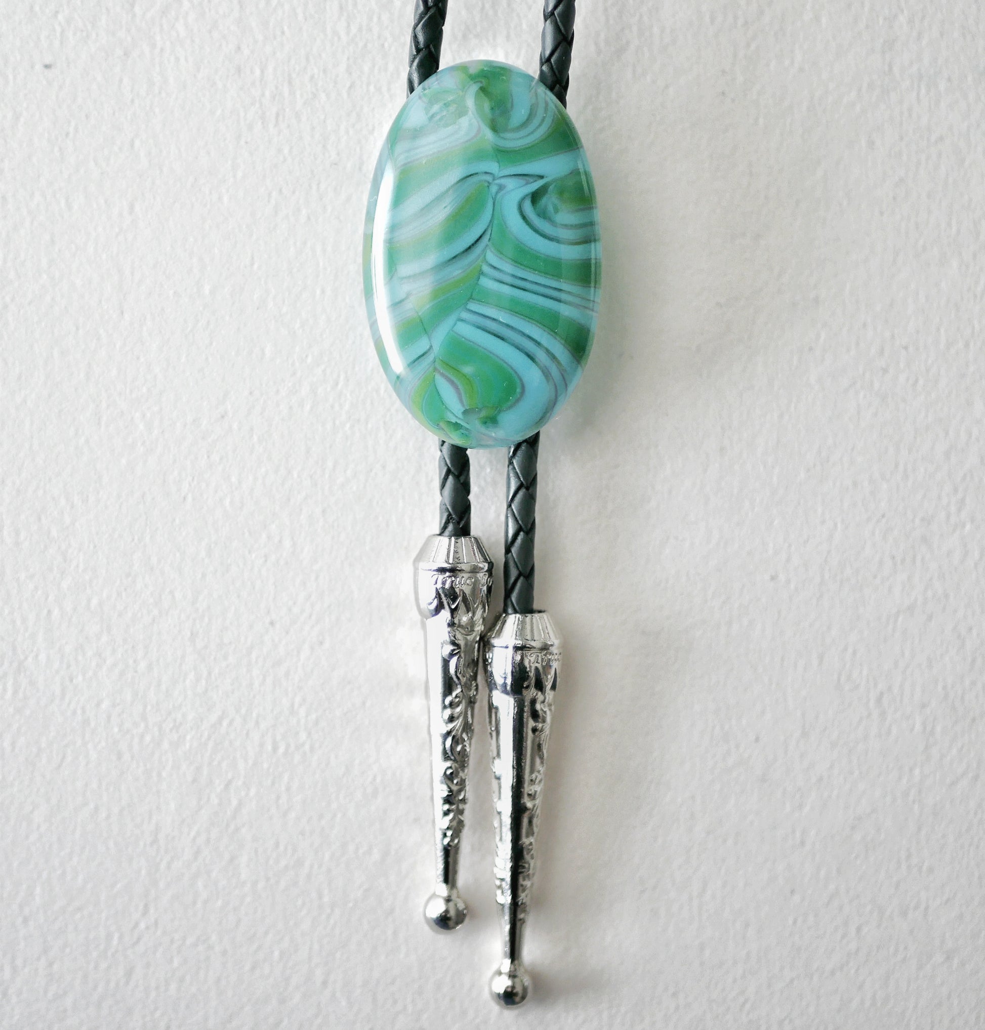 A fused glass cabochon on a 42 inch leather bolo tie with a flat back so it sits nicely under your collar. Base metal findings.