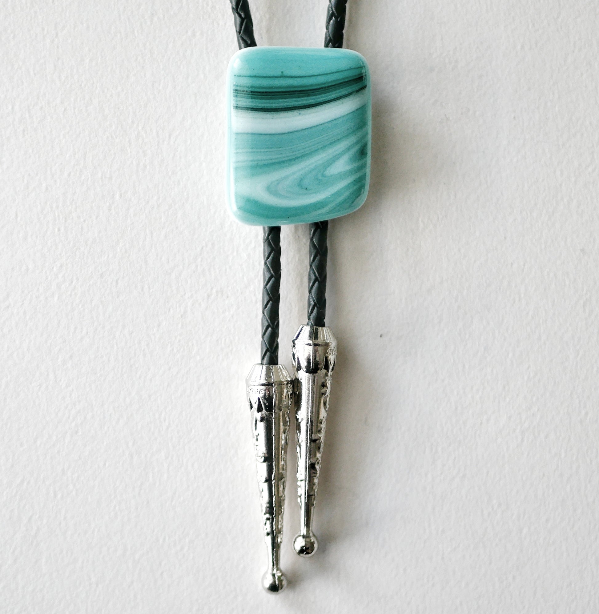 A fused glass cabochon on a 42 inch leather bolo tie with a flat back so it sits nicely under your collar. Base metal findings.
