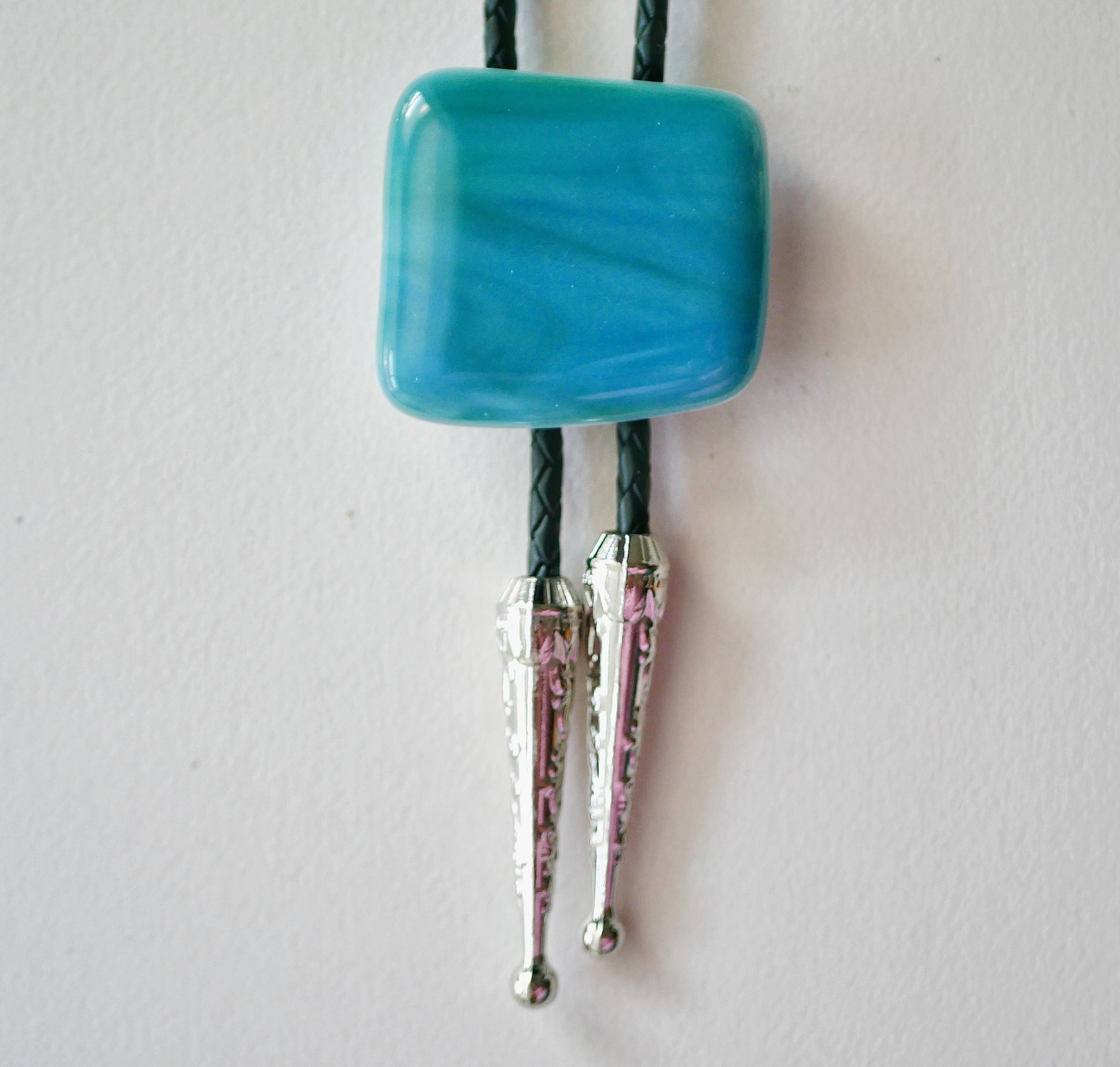 A fused glass cabochon on a 42 inch leather bolo tie with a flat back so it sits nicely under your collar. Base metal findings.