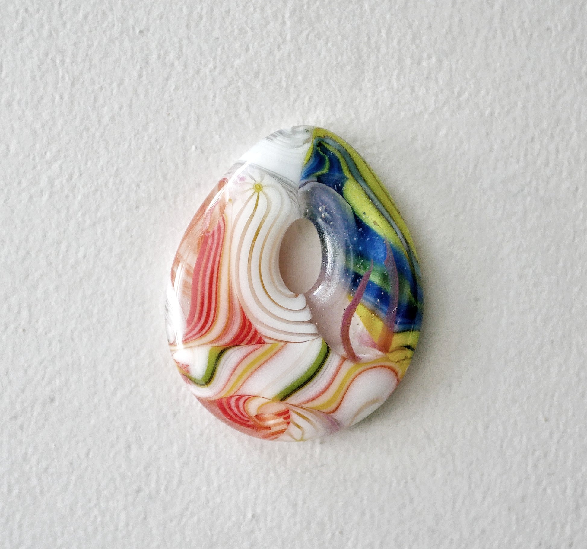 NOTE: This is a handmade glass item. That means it's a little bit fragile. I recommend not wearing it with other necklaces that can clink against it, avoiding dropping it, and don't take it suddenly from one temperature to another. Art glass is not mouth safe.