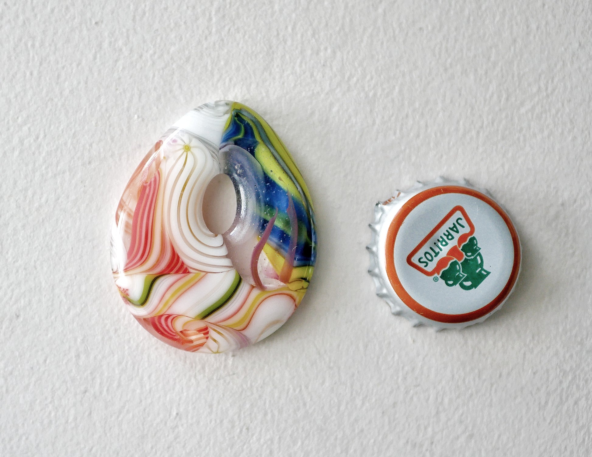 Handmade in my kiln by me! The swirling colors in these come from twisted glass cane that has been cut up and remelted.