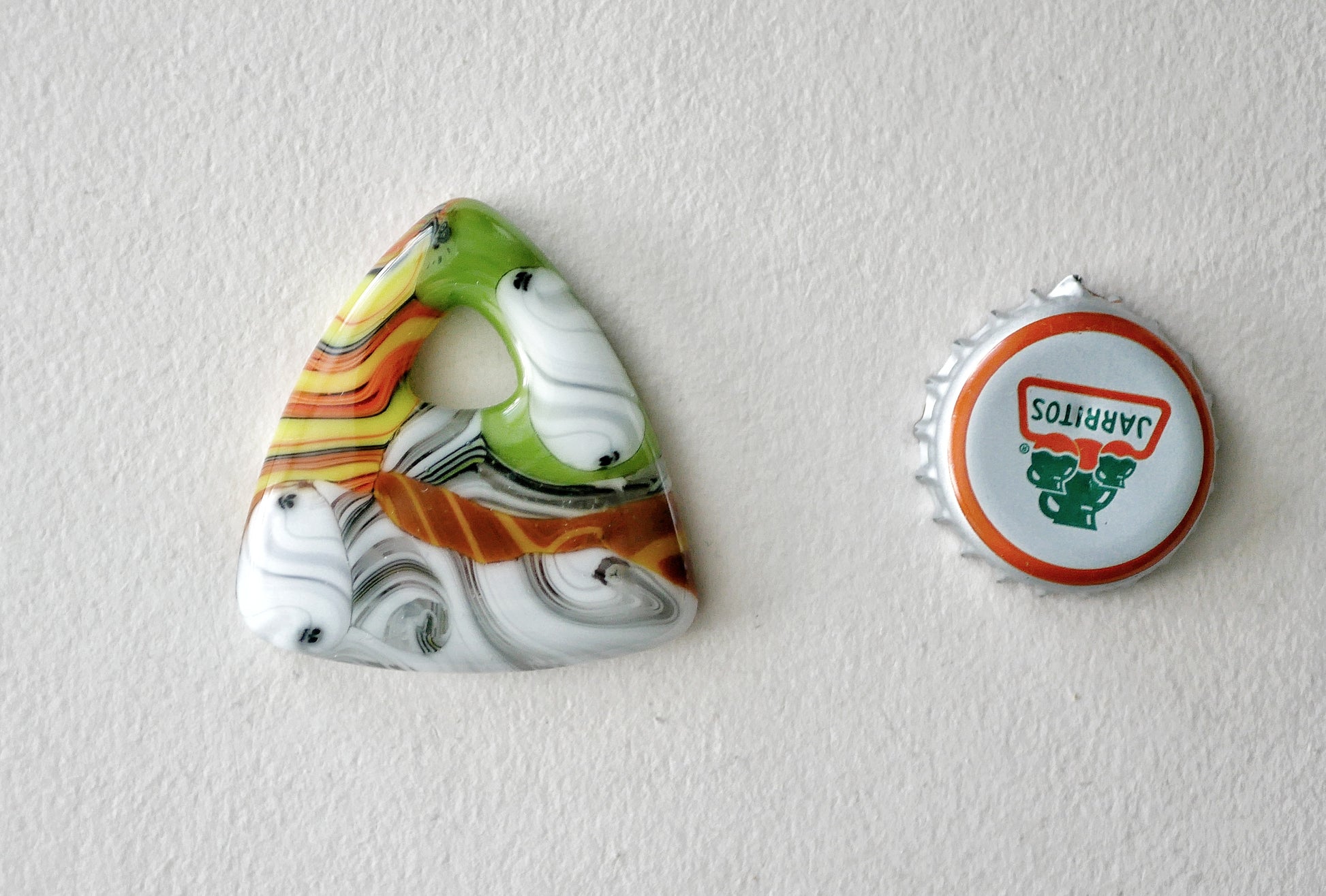 Handmade in my kiln by me! The swirling colors in these come from twisted glass cane that has been cut up and remelted.