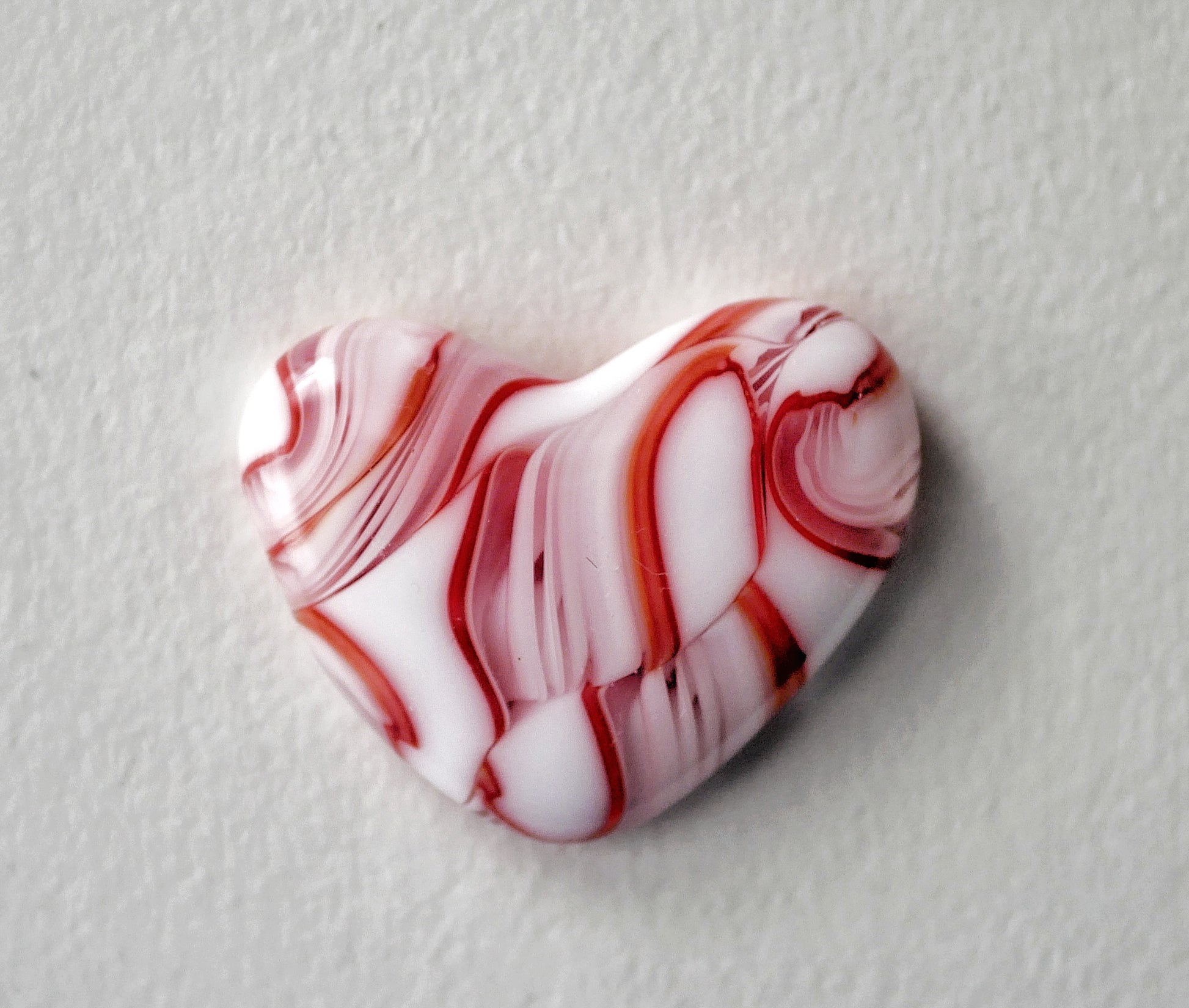A piece of handmade fused glass in the shape of a heart, great as a gift to remind someone you love them.