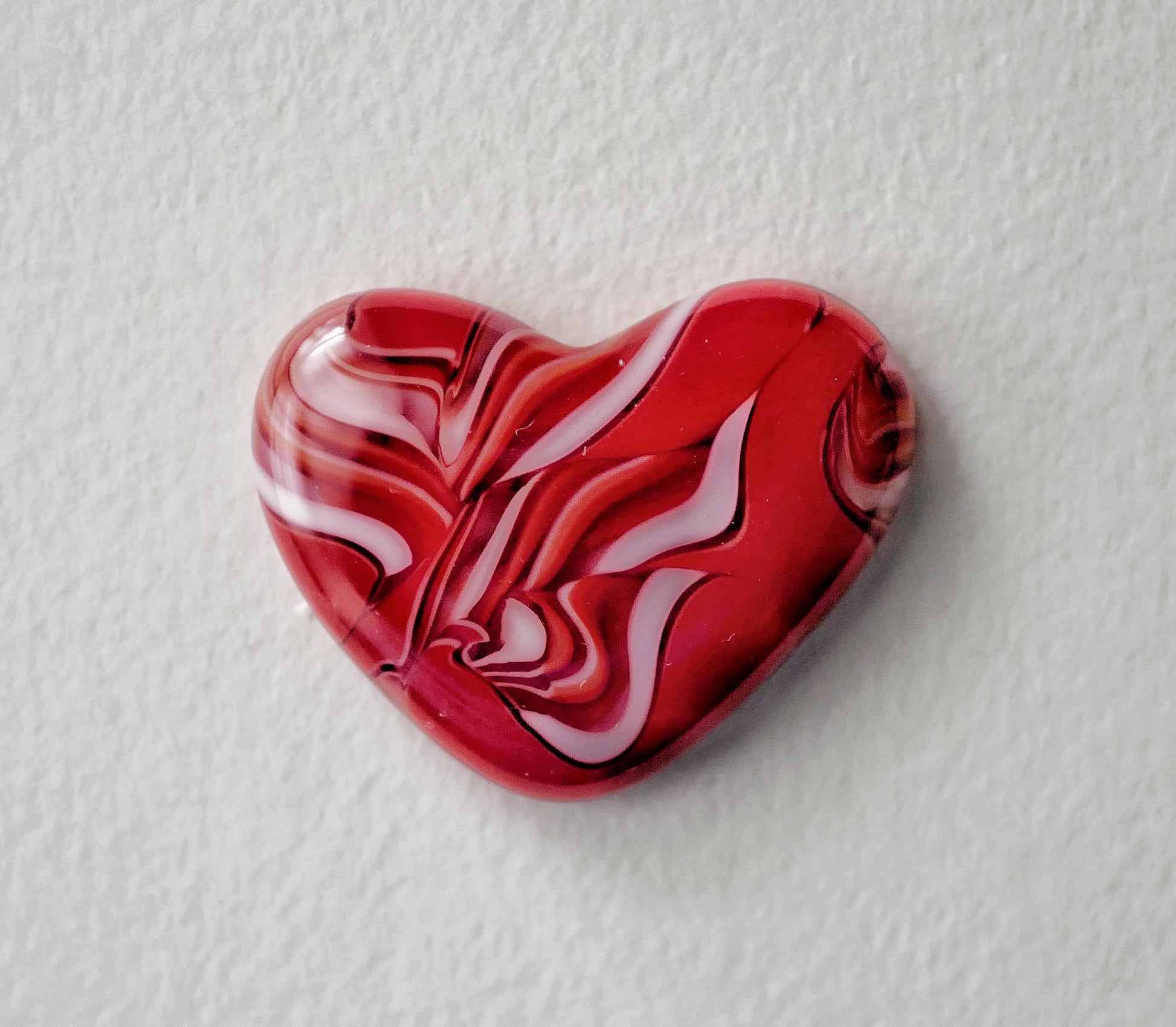 A piece of handmade fused glass in the shape of a heart, great as a gift to remind someone you love them.