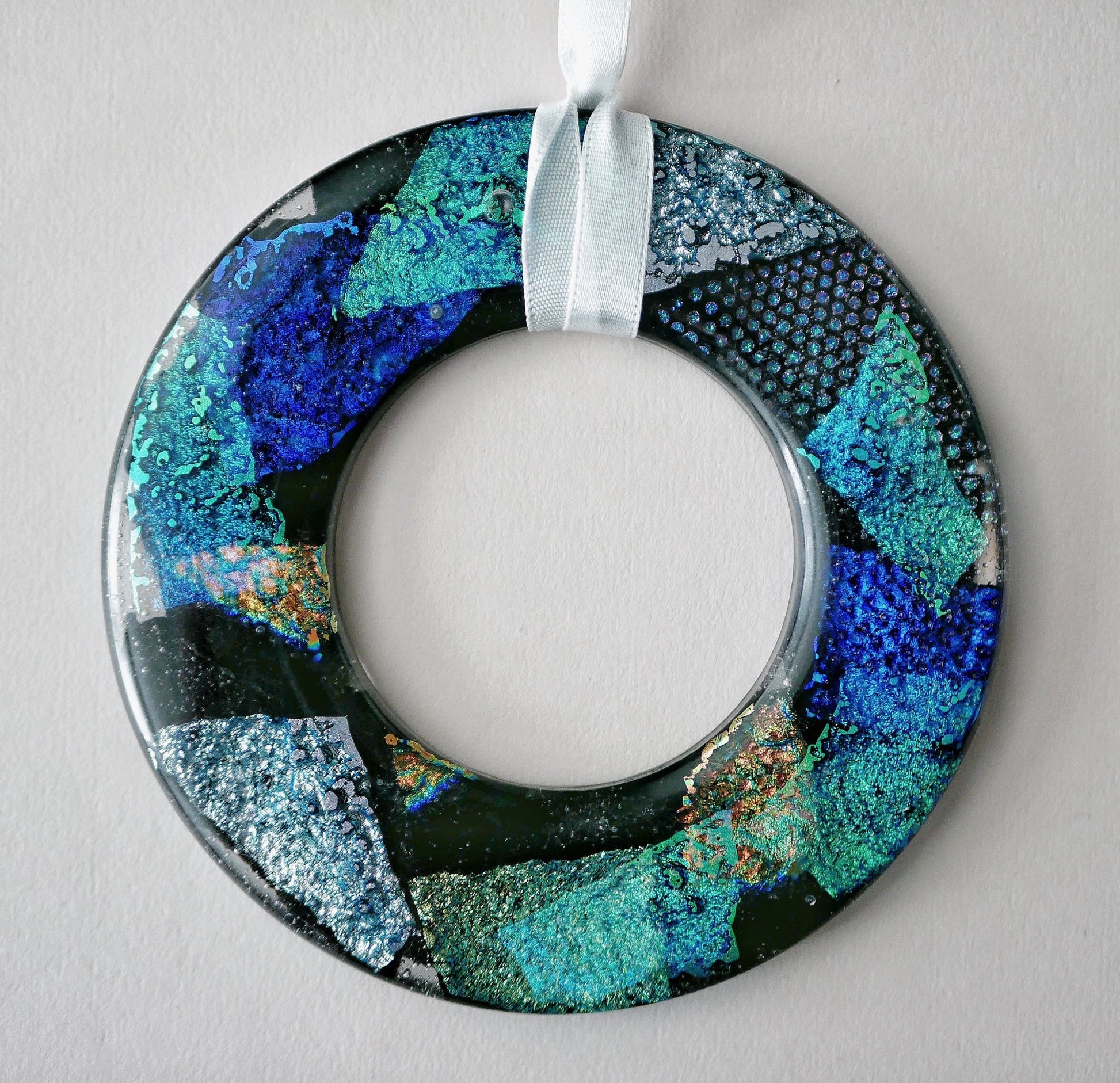 Handmade in my kiln by me! These wreaths are made from dichroic glass that sparkles in the light. They're about 6 inches across and come in a fancy storage box for the off-season.